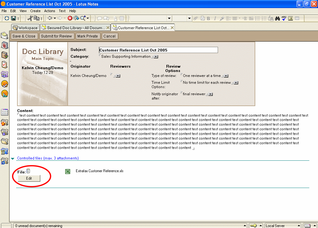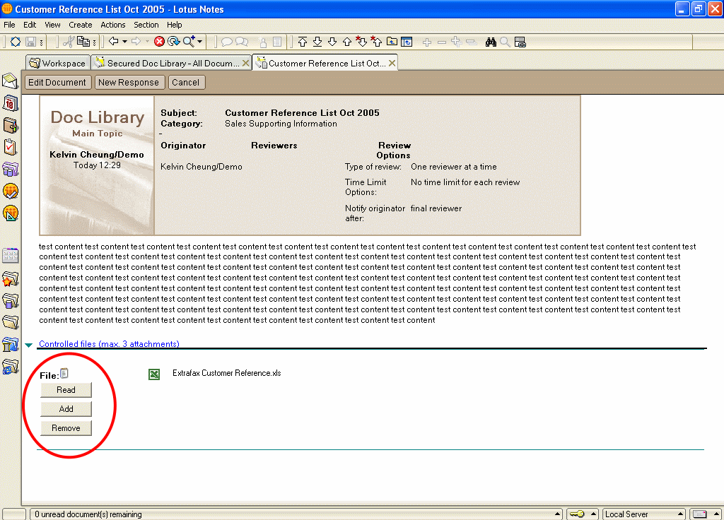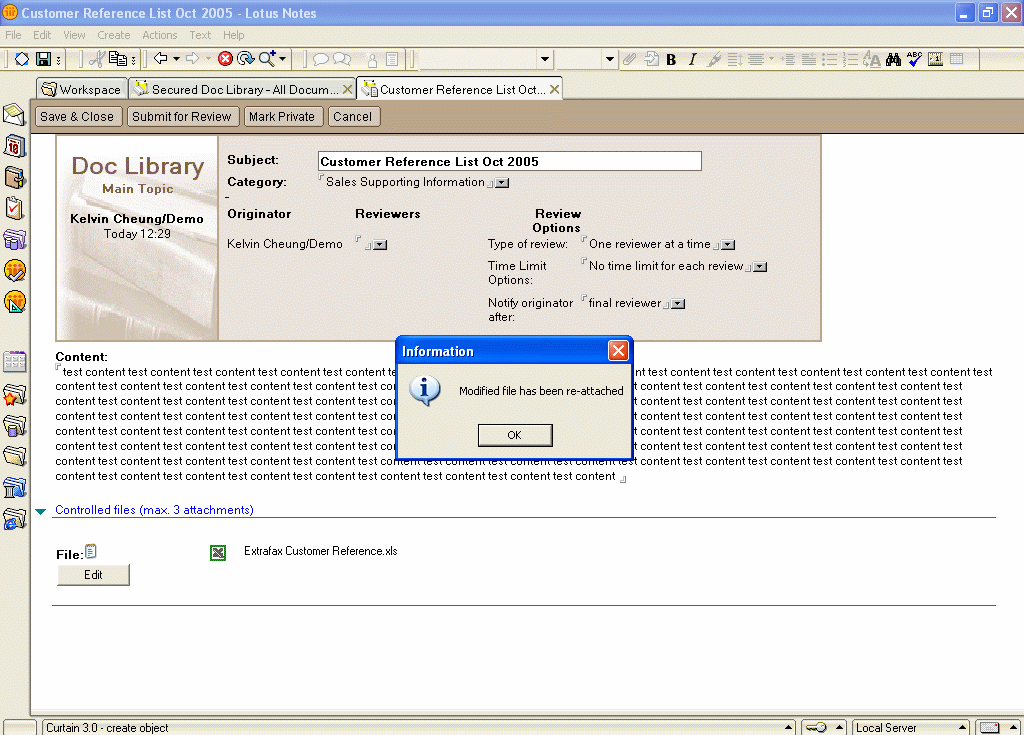 Curtain e-locker can be seamlessly integrated with IBM Lotus Notes database. It could be a tailor-made Lotus Notes system, or standard Lotus Notes template. In this page, we demonstrate how Curtain e-locker works with a standard Notes R6 Document Library template.